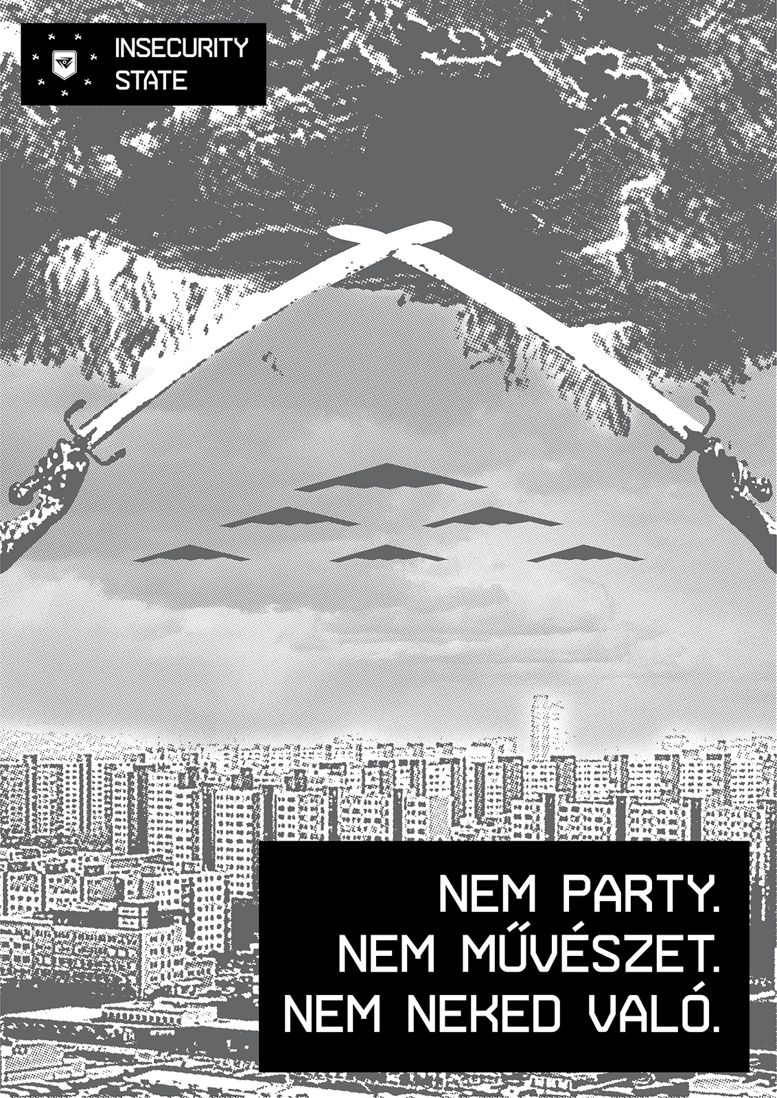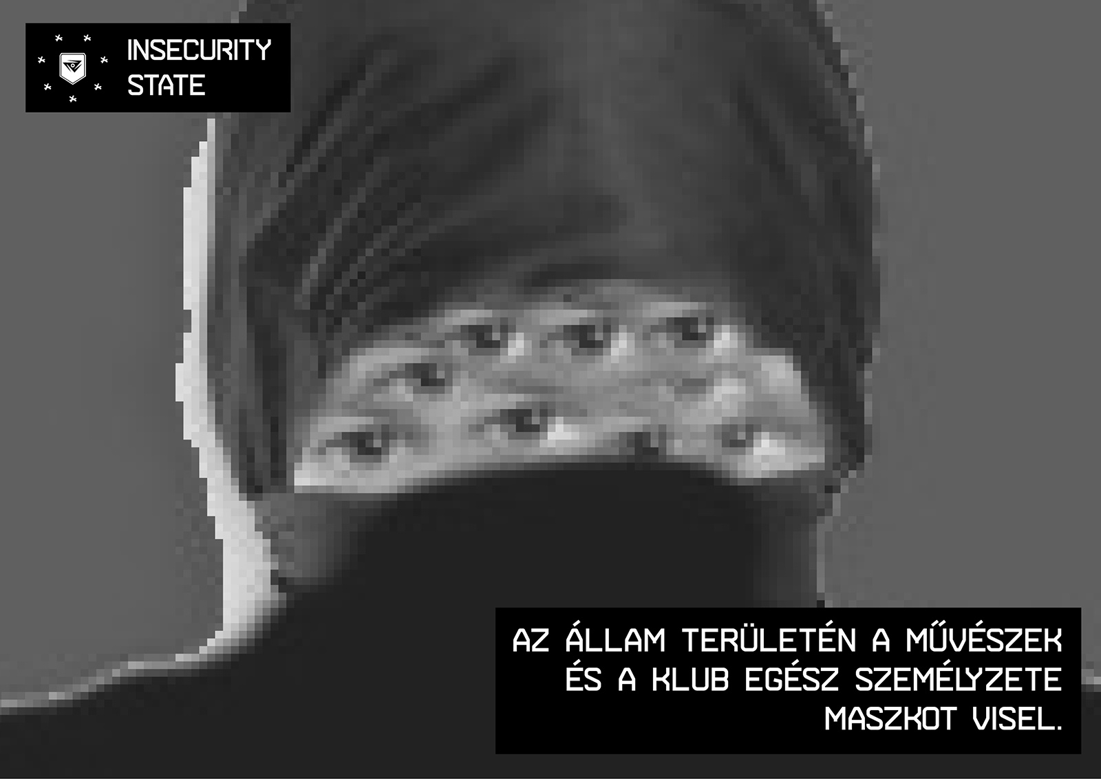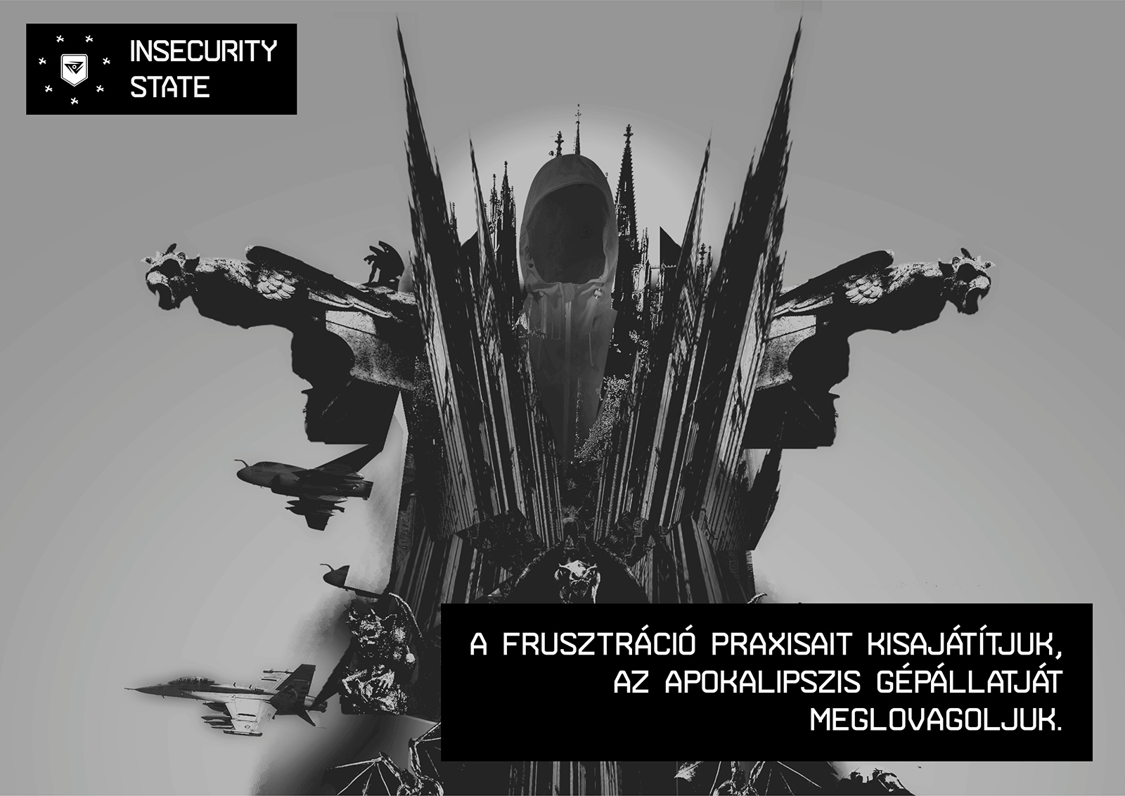 The Insecurity State is a para-state space which, taking the principle of “Temporary Autonomous Zone” (Hakim Bey), emerges via techno as intermedial aesthetics. It comprises an artistic (anti-)state and active community that subverts the militant and uniforming practices of the systematic thinking from within, creating an oppression-busting trance condition. This means that the counter-state built into the heart of the oppressive system imitates and, at the same time, dismantles the forms of state violence. That is, it over-cares and over-insures those who enter the space of the state, but on the other hand, it unlocks and increases the operation of the disciplining systems to a state of emergency.