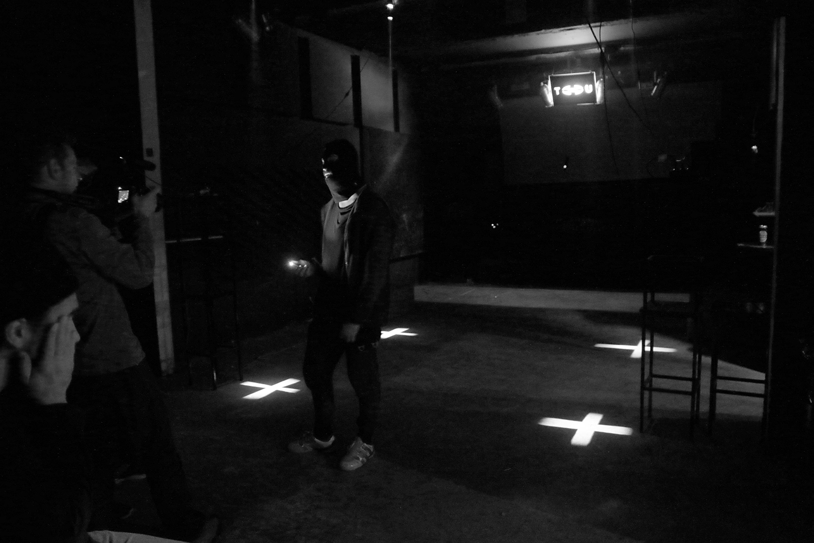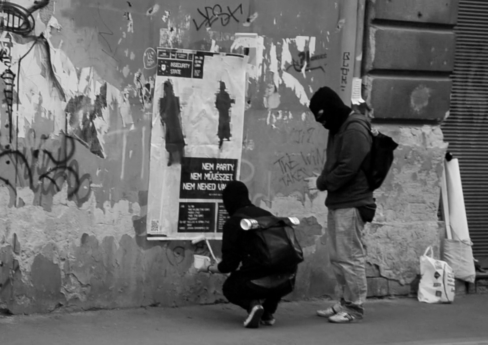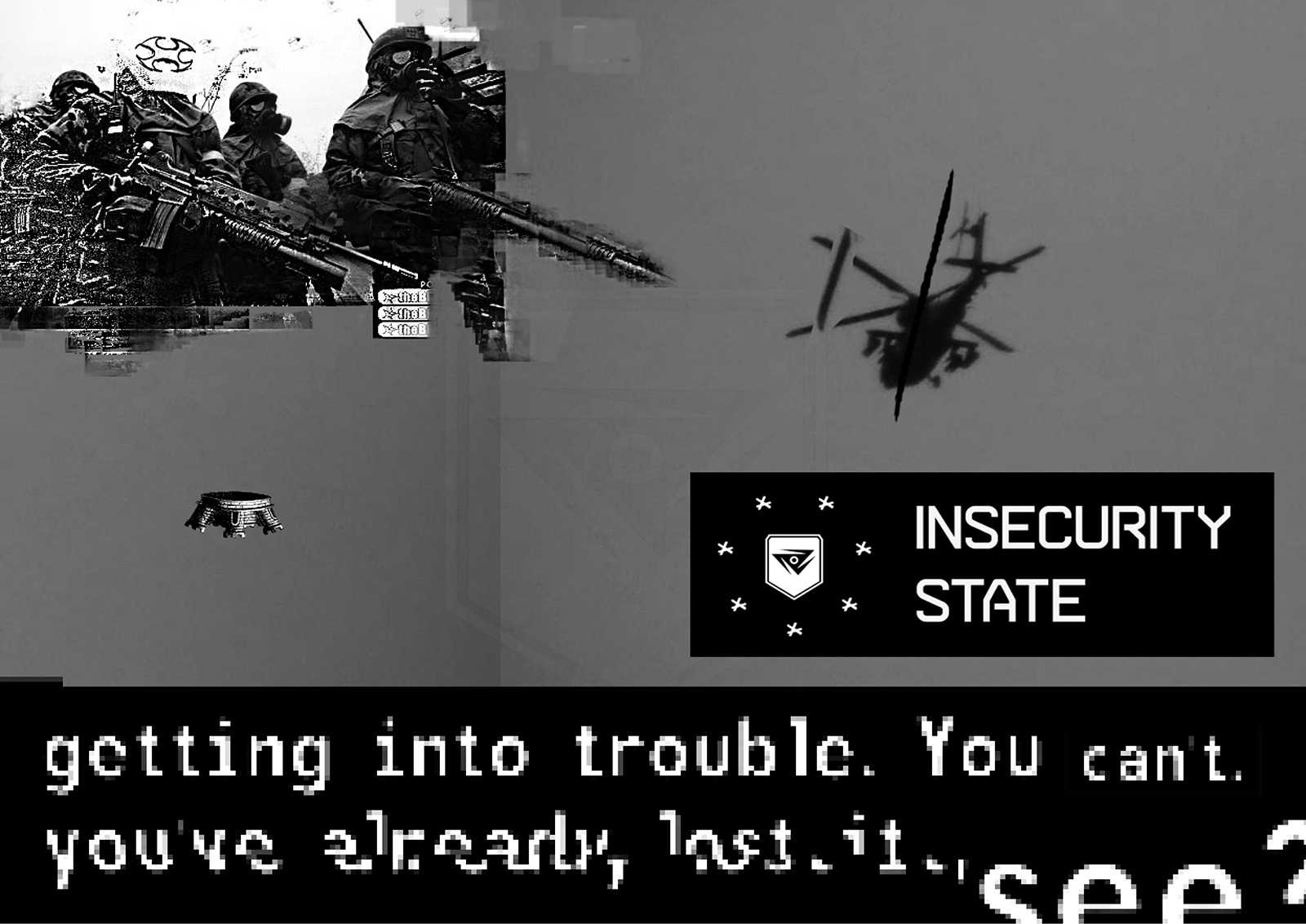 The Insecurity State is a para-state space which, taking the principle of “Temporary Autonomous Zone” (Hakim Bey), emerges via techno as intermedial aesthetics. It comprises an artistic (anti-)state and active community that subverts the militant and uniforming practices of the systematic thinking from within, creating an oppression-busting trance condition. This means that the counter-state built into the heart of the oppressive system imitates and, at the same time, dismantles the forms of state violence. That is, it over-cares and over-insures those who enter the space of the state, but on the other hand, it unlocks and increases the operation of the disciplining systems to a state of emergency.