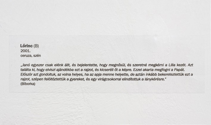 “Janó once stood before us and announced that he was going to get married, that he would like to ask for Lilla’s hand. He came up with the idea of bringing this drawing as a gift, and to exchange it for Lilla. He wanted to get a hold of her father with this. At first we thought, that would be correct if his father would go in his place, but finally we rather framed this drawing, dressed up our son nicely, and we set him off with a bunch of flowers to make his proposal.” (Bíborka, János)
