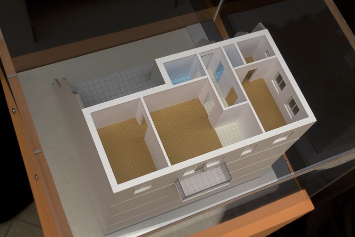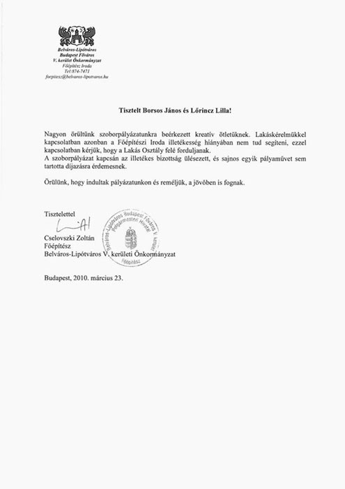 The artist applied for the Sculpture Plan Project in the 5th district, Budapest with his marble memorial. His idea was to hang this commemorative work on the wall of the block of flats where he might have bought an apartment, which would have been purchased from the awarded project. He made the model of the desired and imaginary flat. Unfortunatelly there was no awarded plan on the tender.
