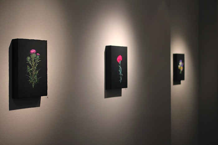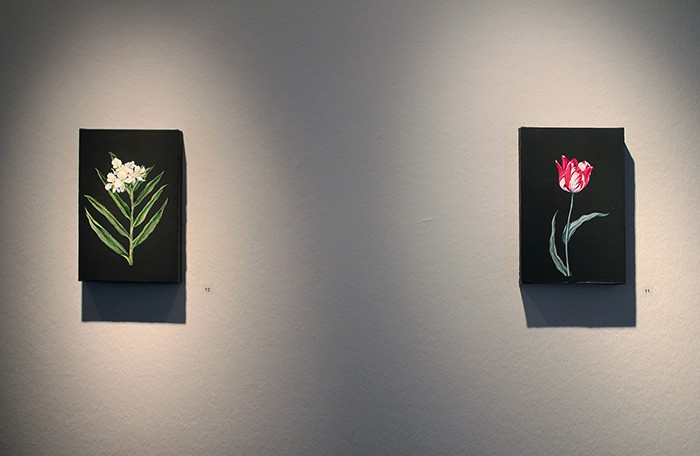 From the start of the project, aspects of form and content have been strongly disconnected. While Lőrinc was painting, Borsos was conducting a research based on principles diverging from his prior practice, incorporating fictive and real elements, regarding the social, historical, political and economic layers of meaning underlying each flower. Thus, the artist duo remedied the “unquenchable” desire of painting beautiful floral stills and the internal blocks curbing their creation with a conceptual flower project. Therefore, the exhibition might as well be apprehended as a form of self-therapy in accordance with the principles of homeopathy: like cures like.