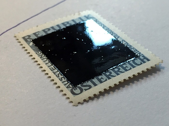 In 1946, for an exhibition titled Niemals Vergessen, the federal countries designed a 10 piece series of stamps. From the 10, finally just 8 was published, to was censored because of their agitating content. In this work all of the ten can be seen together, but all of the image parts of the stamps are covered with enamel paint, also known as Blaek frequently used by the artist. The glossy black voids are capable of being charged with censorial, destructive, alienating, appropriating or self-reflexive narratives, depending on the context. In this case we mostly can speak about censorship.