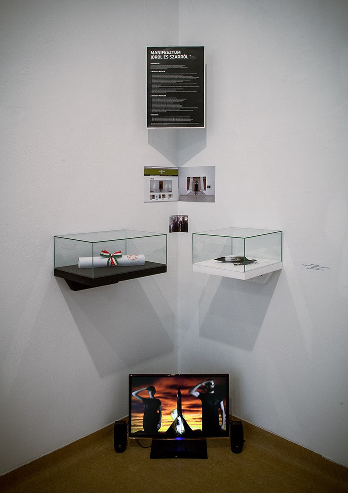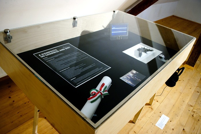 As the main part of the project, the artist wrote the 'A Manifesto on Goodness and Shit 1.0' (download in pdf), what (s)he published in several exhibitions and delivered it directly to cultural politics (Delivery). In the in the middle of the installation there is a documentation of a site specific action which was reflected on the Műcsarnok's state as a political issue (Outer and Inner Space). During the project the artist made self reflections on it (The Remarkable Rocket - video / object) and made them take part in the installation as well.