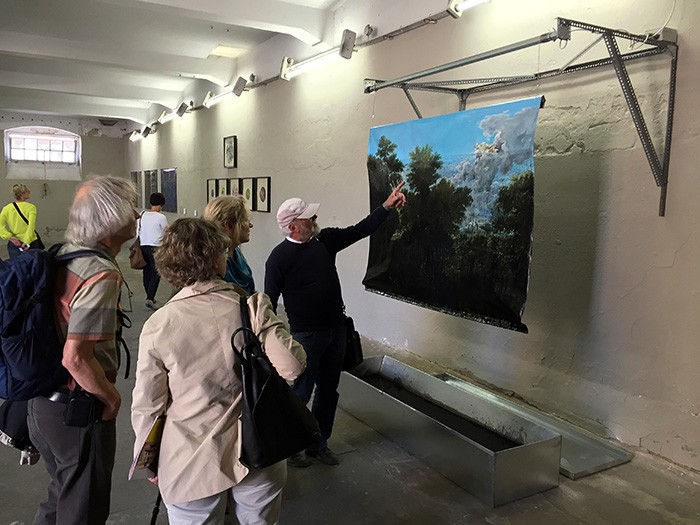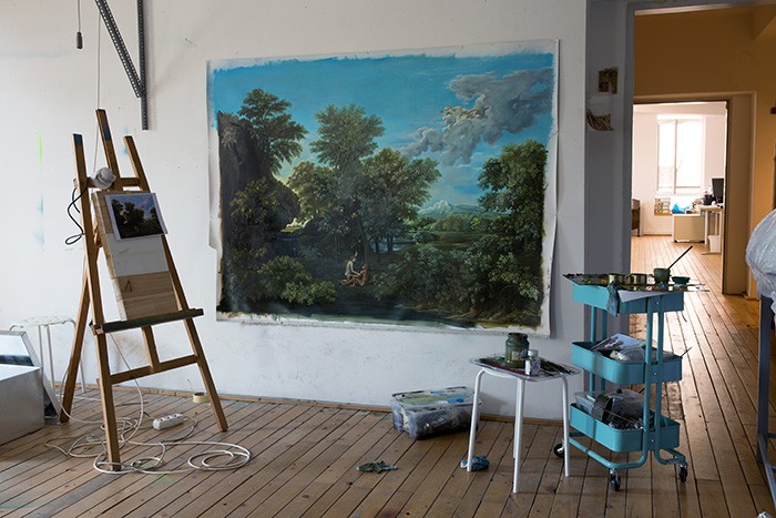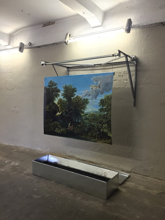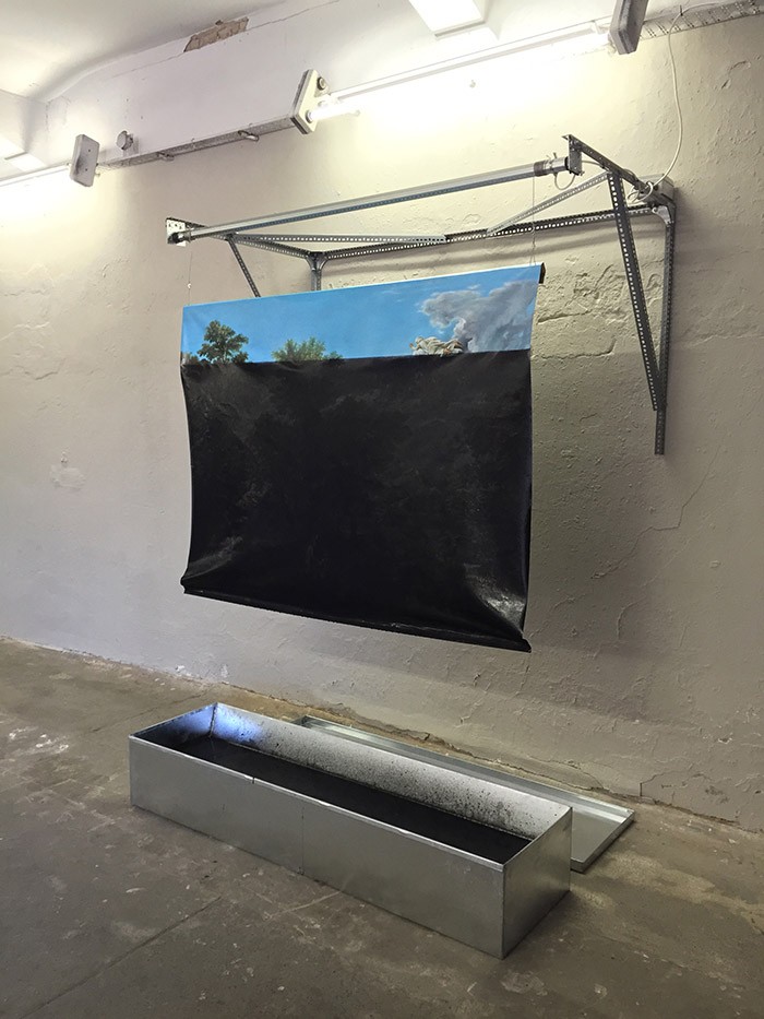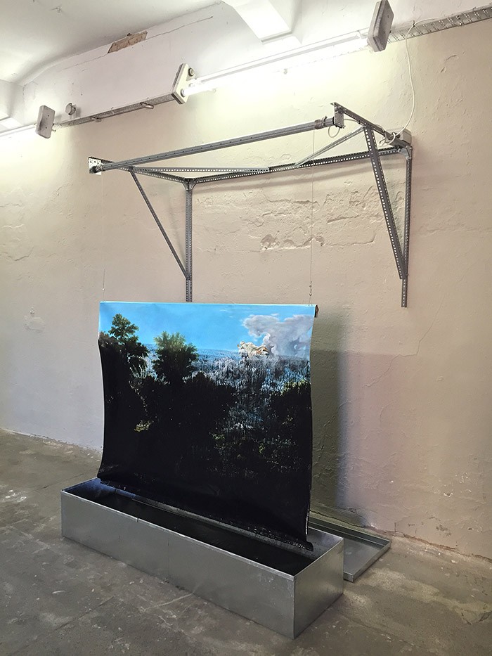 As opposed to other pieces in the series, in case of this painting, which is a 1:1 replica, the dark matter is applied onto the surface not by the artist, but the visitors of the exhibition in the course of a performative act. A motion detector is linked to a mechanism that, when activated by a visitor who walks into its range, submerges the painting into a tub filled with black enamel varnish and then brings it back to the original position. The thresholds of the masking are set so as to obscure the figures in the painting, only leaving the foliage of trees and a narrow strip of the sky visible. During the exhibition, the painting is continually coated in enamel paint, in direct proportion to the number of spectators viewing it. Bearing an increasing load, the painting can be considered complete by the end of the exhibition.
