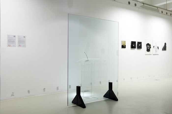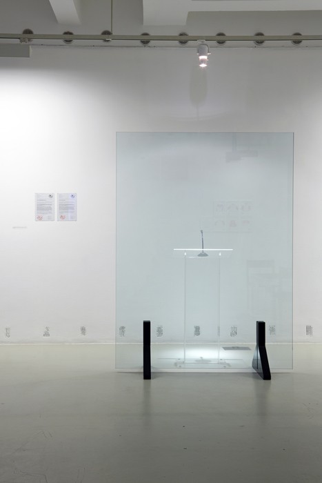 folied glass, powder painted, acid-proof steel construction, plexi pulpit, microphone and tripod | 60x1500x2000 mm | Collection of the Institute of Contemporary Art, Dunaújváros