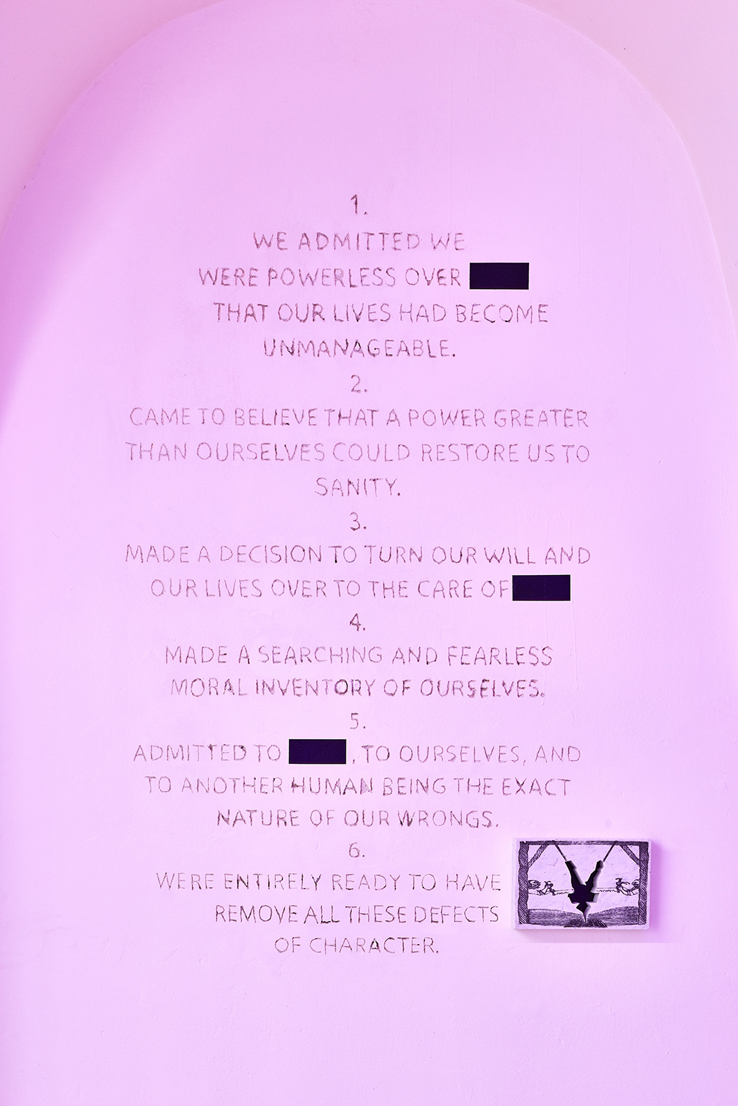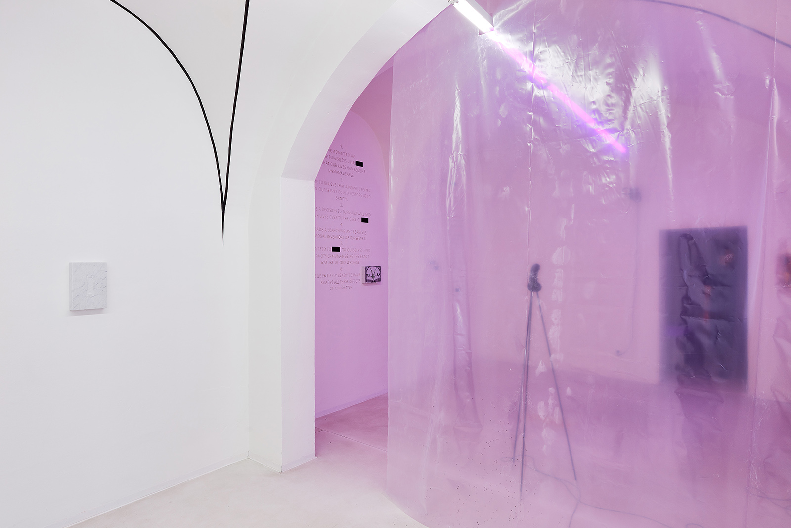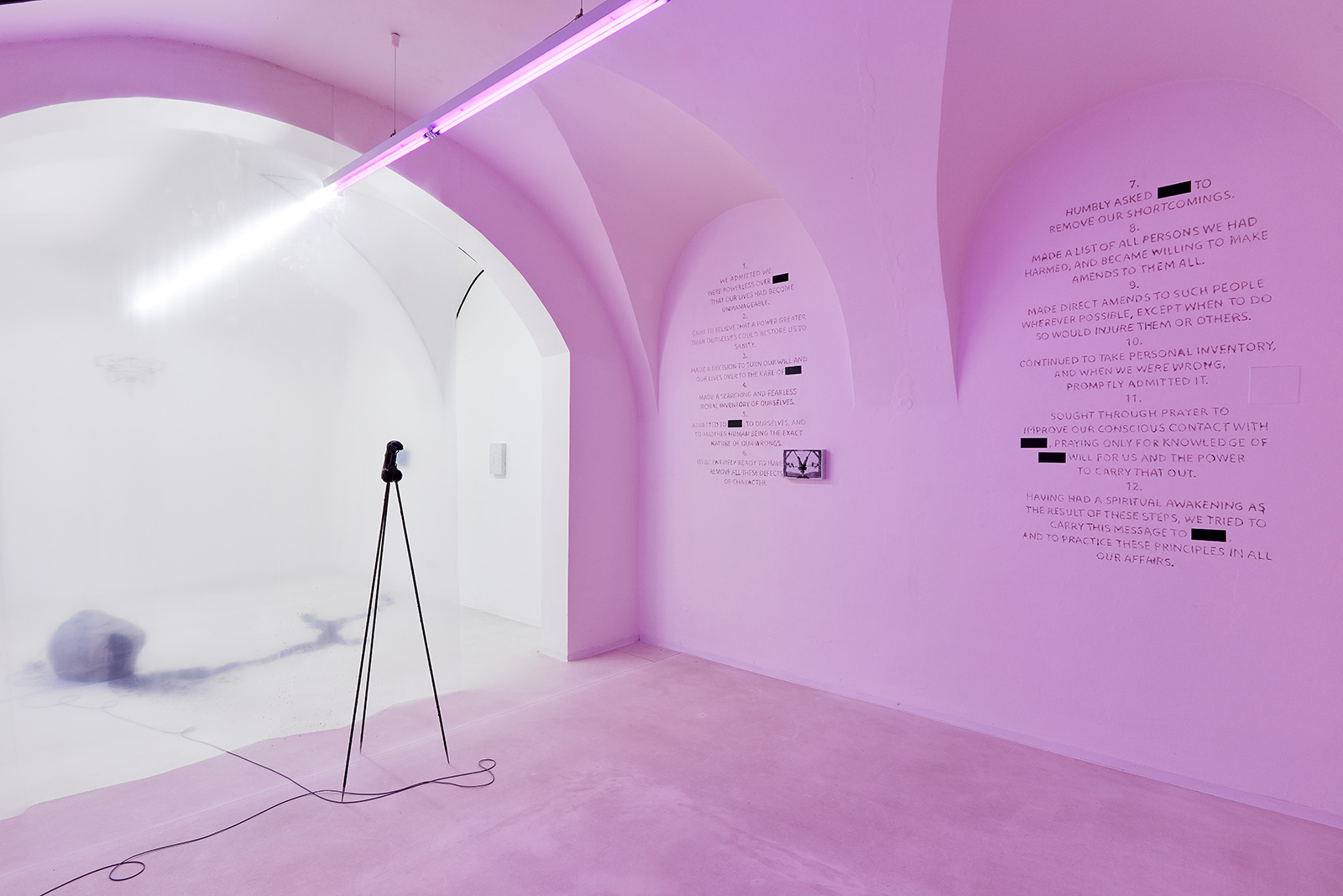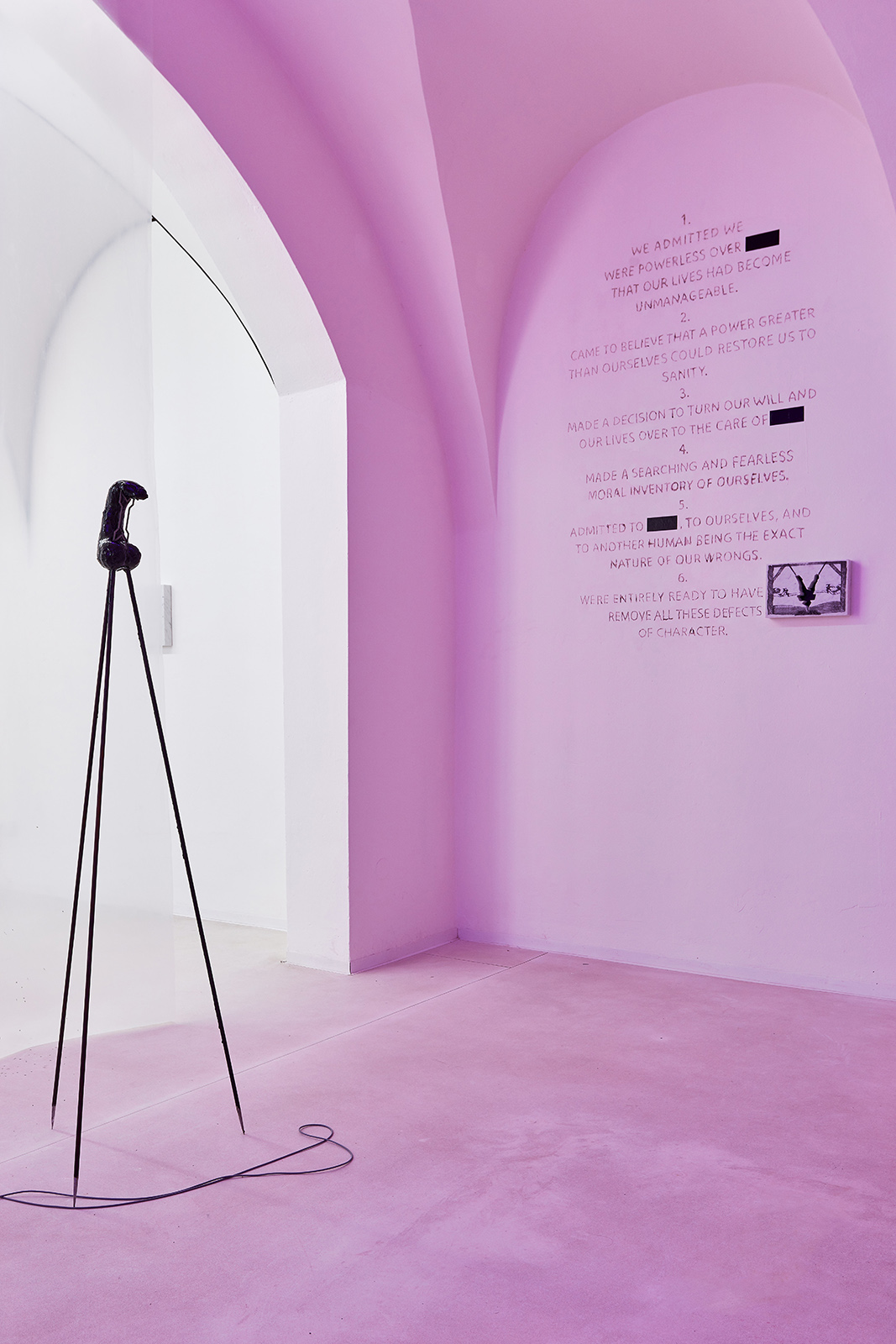 With the help of diverse fetish objects, inward trips, spiritual retreats, or even a 12-step program based on a personal and fearless moral inventory, the exhibition is an attempt to reconstruct some already existing frameworks. It proposes such new systems that allow extremities, the categories of good and evil, you and me, or other bipolar opposites to dissolve in each other, systems that make it conceivable to cross over between different worlds and are capable of creating space for the third half.