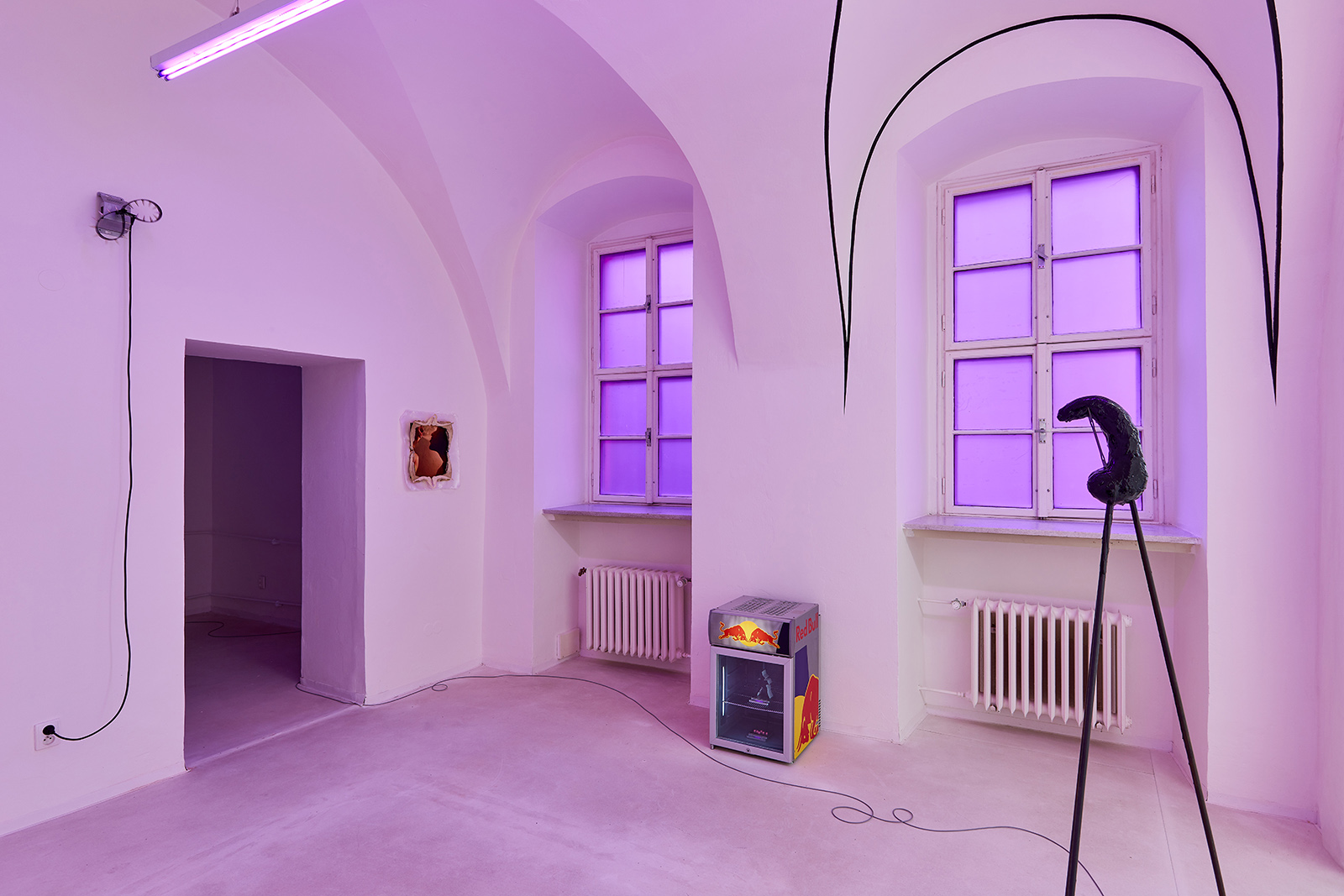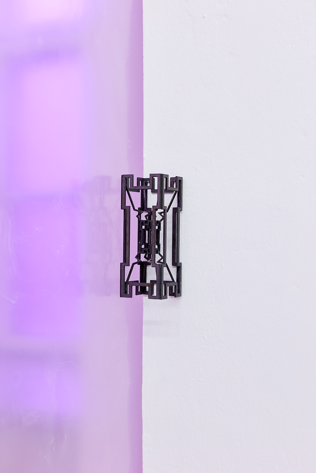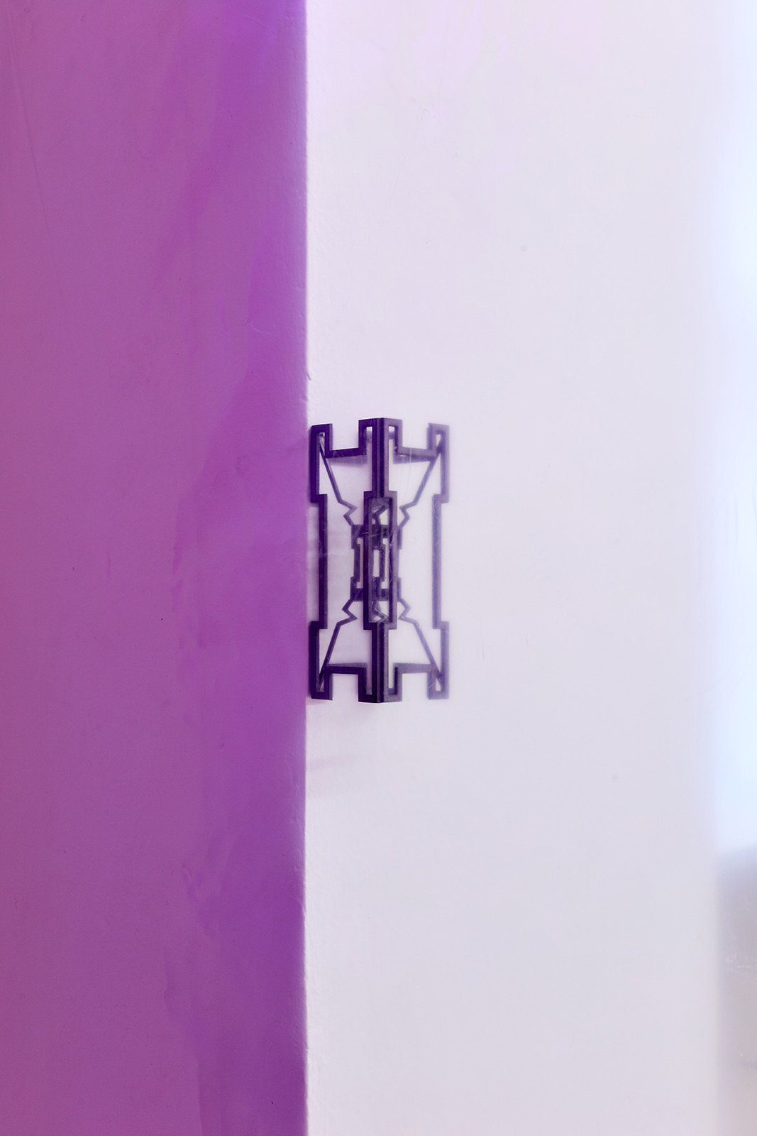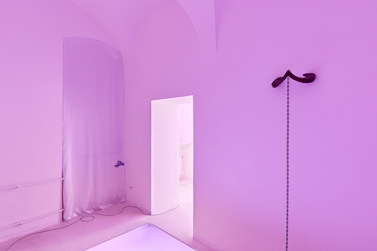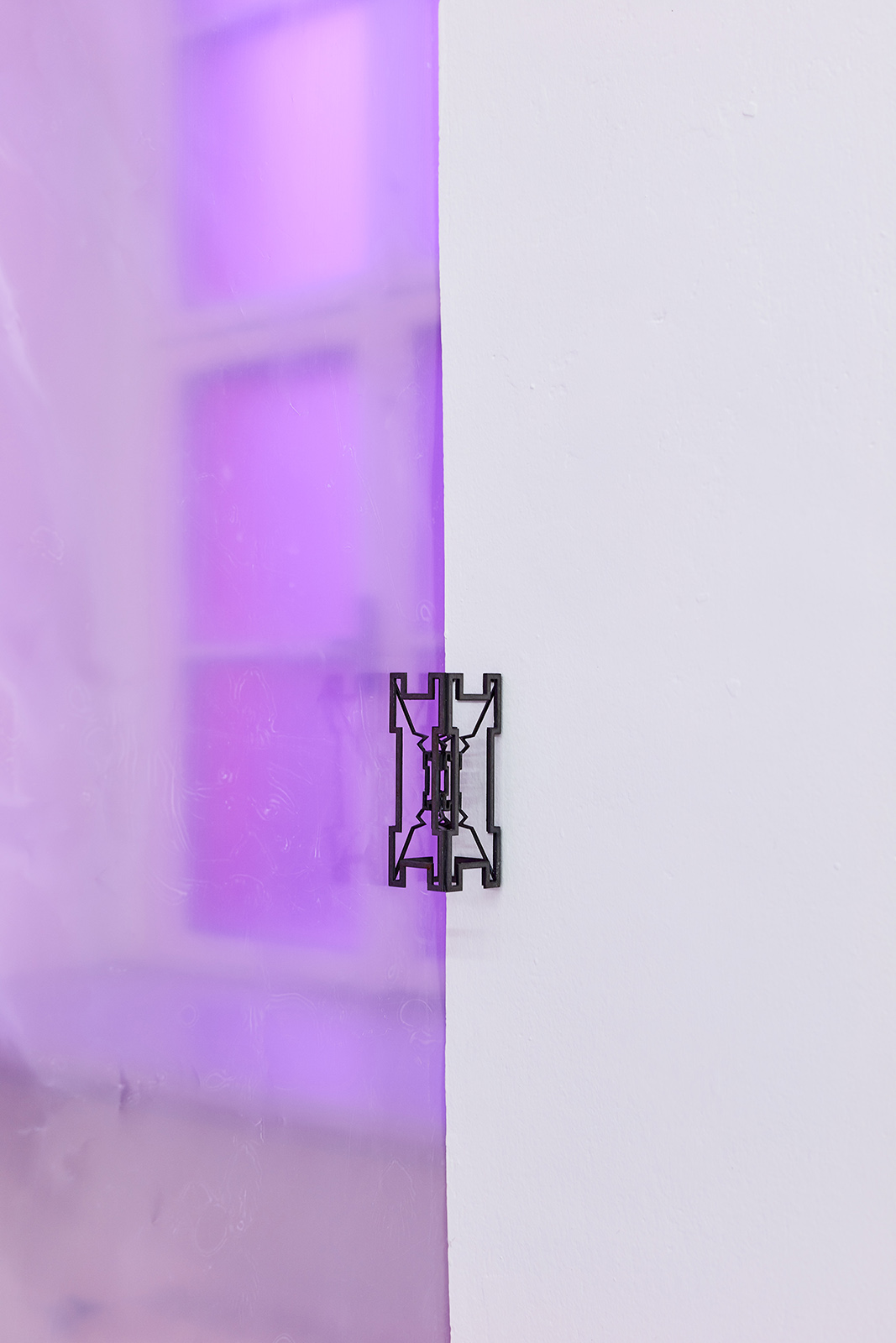 The exhibition space appears like some night club accommodating neo-occult, techno-spiritualist séances, in which the repetitive beats and fetish objects are complemented with diverse biblical, alchemical and mythological allusions. The basic rhythm is provided by an anthropomorphic shape also related to alchemical and other (religious/personal) references. This shape is an arbitrarily selected element of the marquetry decorating the floor of the Saint Peter’s Basilica in Rome, which Lőrinc Borsos has been employing in their work since 2016, and which – also arbitrarily – they have coupled with the Homunculus theory from 16th century alchemy. According to the concept, humans, or humanoid beings can be produced chemically in a glass flask, as in each sperm cell there is a fully formed human being, a small homunculus that simply grows over time. Not only does each spermatozoon contain a „small human”, but each of those also has sperms containing more small humans. This self-contained system can be imagined as a fractal-like infinite chain. On the one hand, the so-called homunculus form recurring in the exhibition space contains the essence, that is, itself (Hyperhomunculus); on the other hand, demonstrating an extraordinary kind of evolution, it guides us through different levels of self-transcendence.