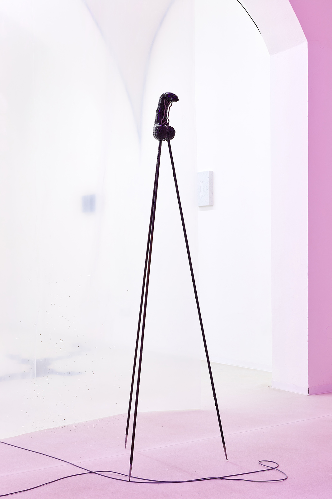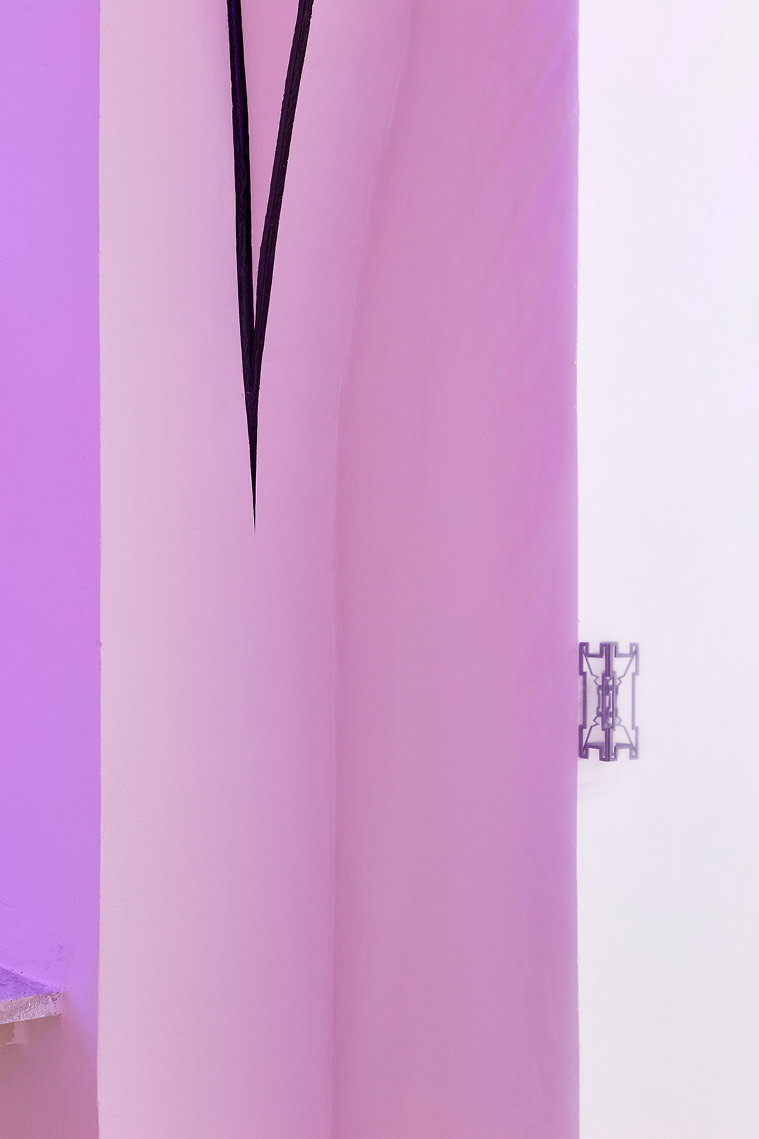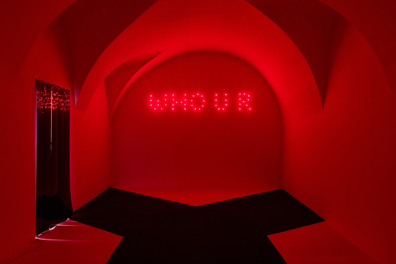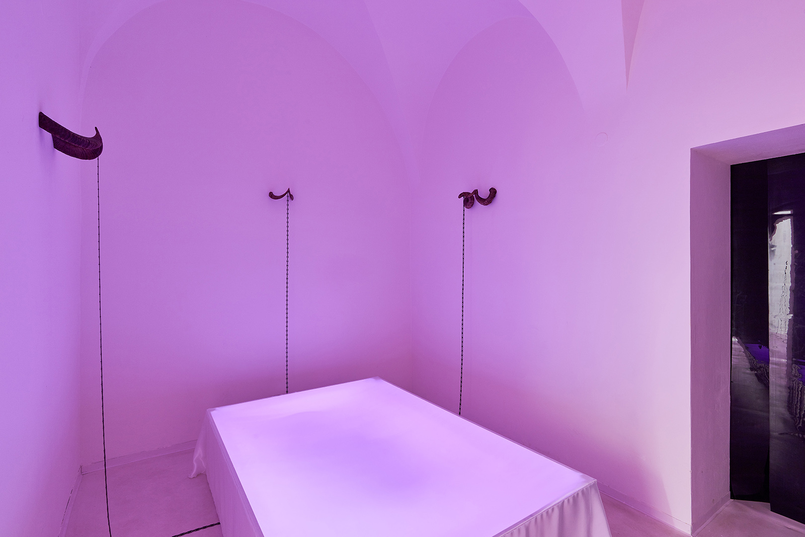 The exhibition space appears like some night club accommodating neo-occult, techno-spiritualist séances, in which the repetitive beats and fetish objects are complemented with diverse biblical, alchemical and mythological allusions. The basic rhythm is provided by an anthropomorphic shape also related to alchemical and other (religious/personal) references. This shape is an arbitrarily selected element of the marquetry decorating the floor of the Saint Peter’s Basilica in Rome, which Lőrinc Borsos has been employing in their work since 2016, and which – also arbitrarily – they have coupled with the Homunculus theory from 16th century alchemy. According to the concept, humans, or humanoid beings can be produced chemically in a glass flask, as in each sperm cell there is a fully formed human being, a small homunculus that simply grows over time. Not only does each spermatozoon contain a „small human”, but each of those also has sperms containing more small humans. This self-contained system can be imagined as a fractal-like infinite chain. On the one hand, the so-called homunculus form recurring in the exhibition space contains the essence, that is, itself (Hyperhomunculus); on the other hand, demonstrating an extraordinary kind of evolution, it guides us through different levels of self-transcendence.
