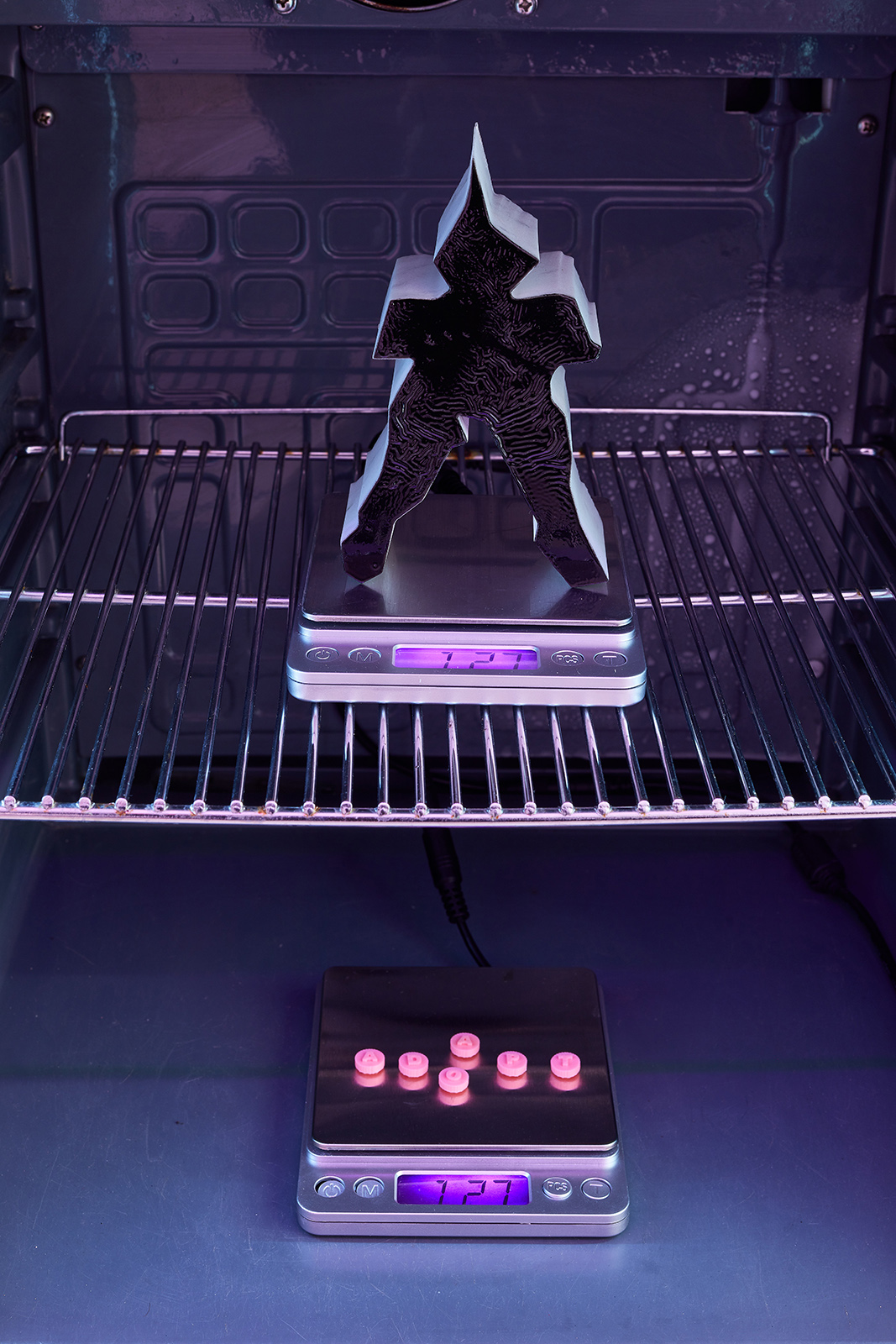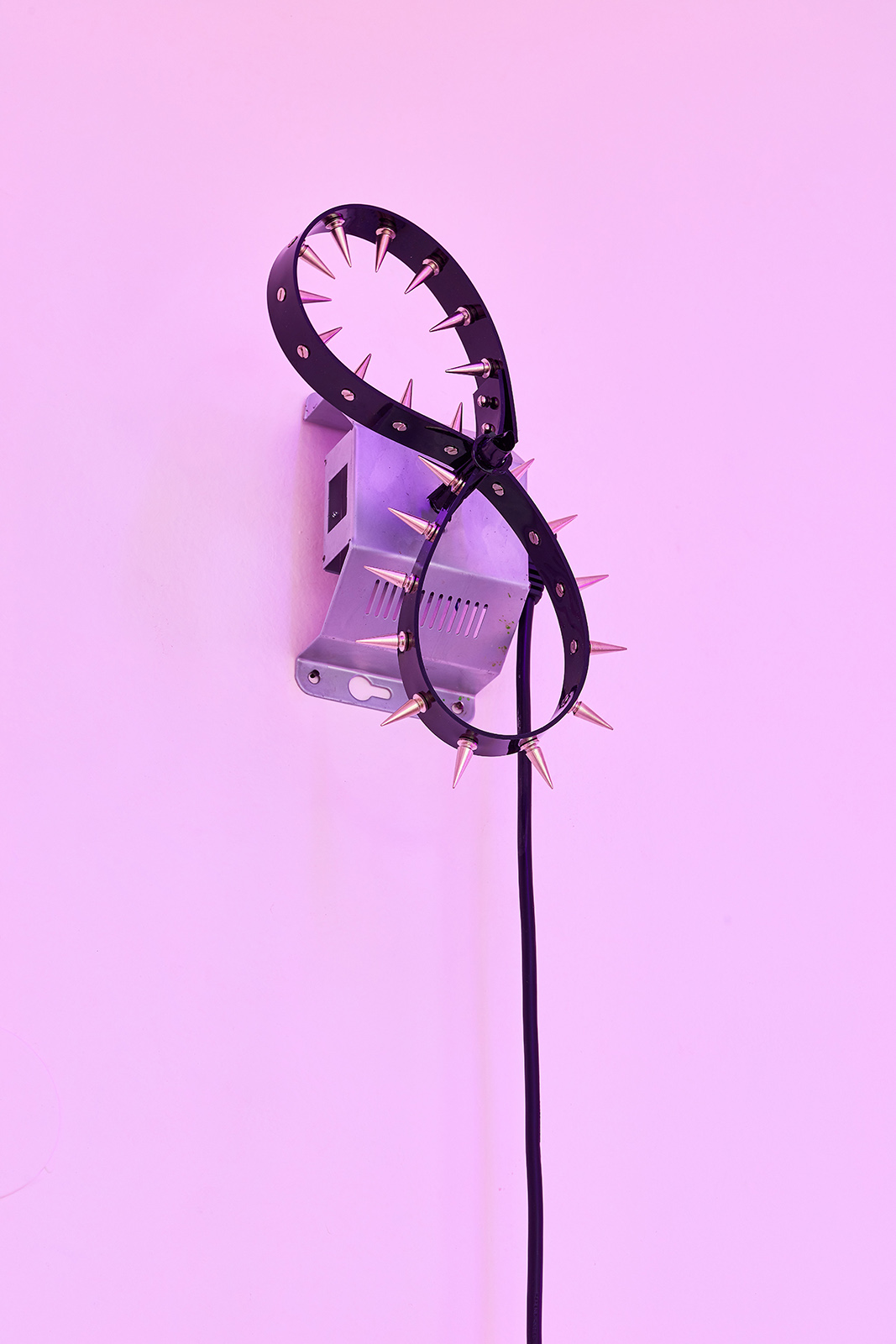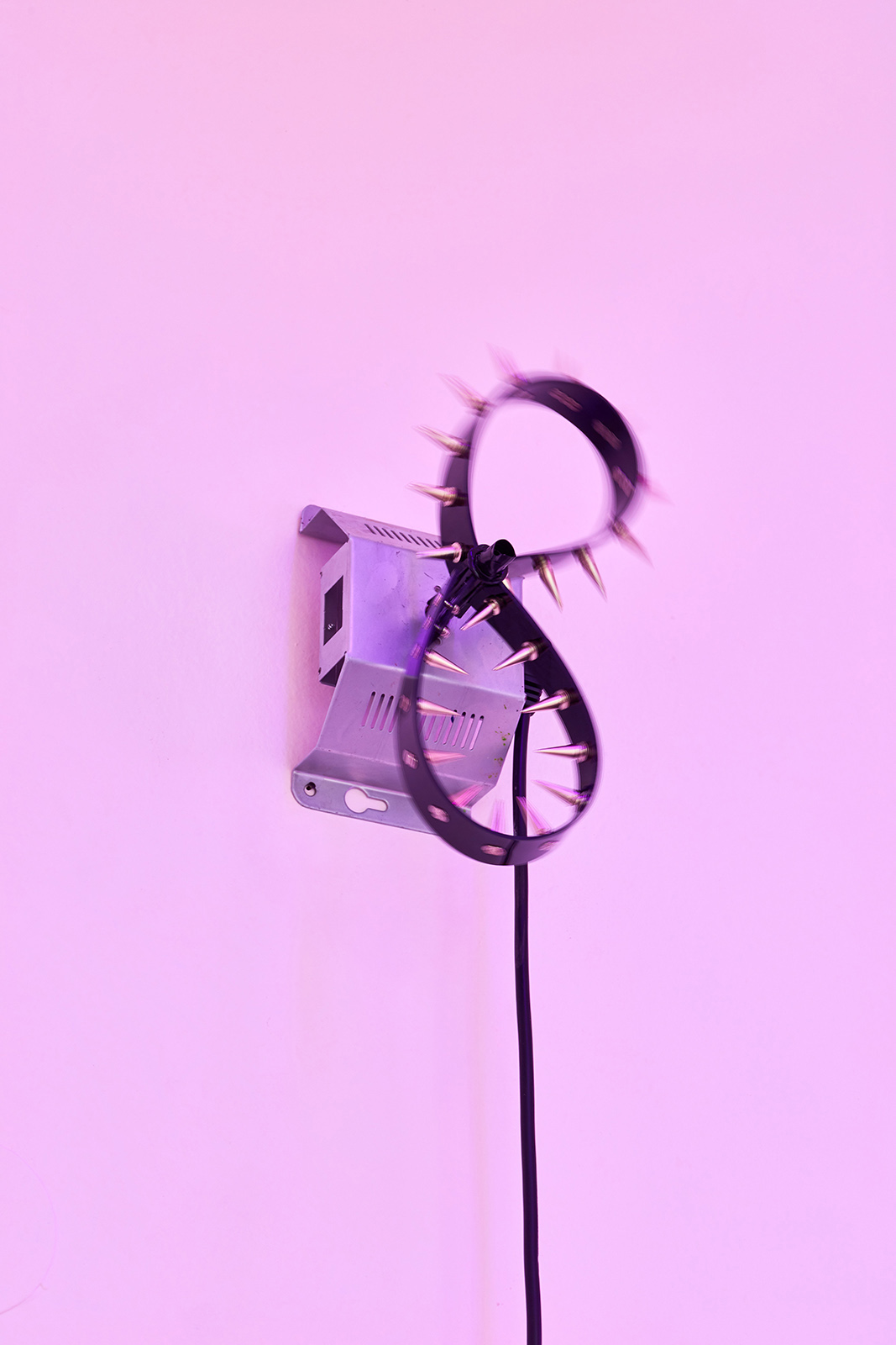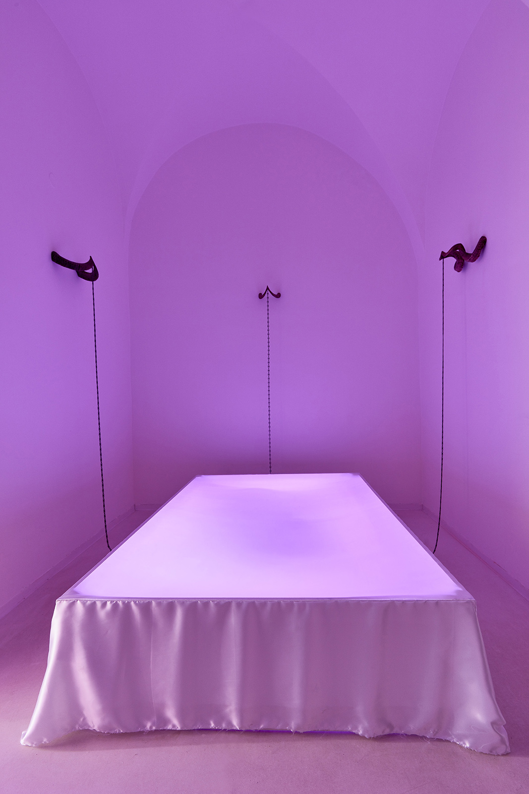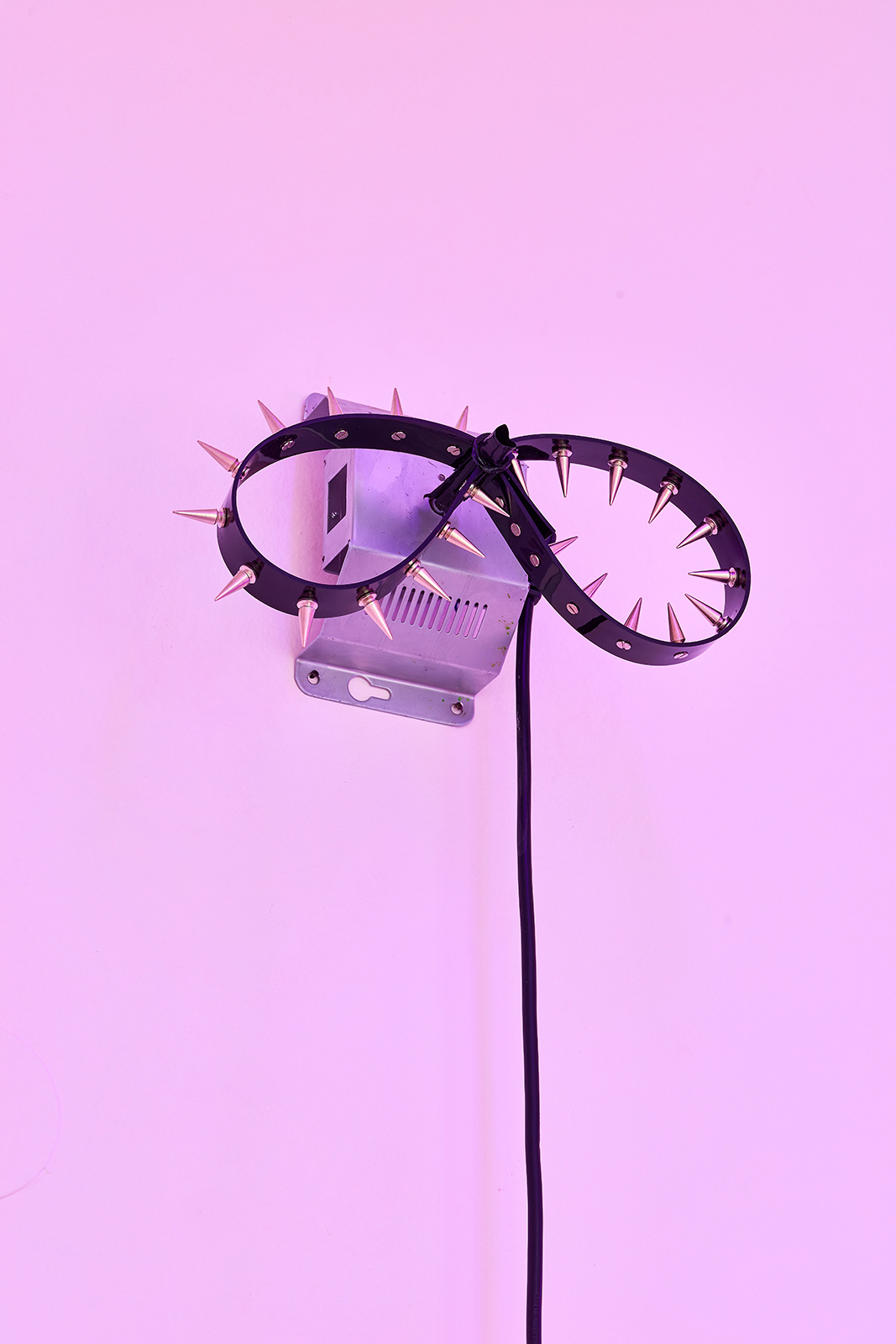 The exhibition space appears like some night club accommodating neo-occult, techno-spiritualist séances, in which the repetitive beats and fetish objects are complemented with diverse biblical, alchemical and mythological allusions. The basic rhythm is provided by an anthropomorphic shape also related to alchemical and other (religious/personal) references. This shape is an arbitrarily selected element of the marquetry decorating the floor of the Saint Peter’s Basilica in Rome, which Lőrinc Borsos has been employing in their work since 2016, and which – also arbitrarily – they have coupled with the Homunculus theory from 16th century alchemy. According to the concept, humans, or humanoid beings can be produced chemically in a glass flask, as in each sperm cell there is a fully formed human being, a small homunculus that simply grows over time. Not only does each spermatozoon contain a „small human”, but each of those also has sperms containing more small humans. This self-contained system can be imagined as a fractal-like infinite chain. On the one hand, the so-called homunculus form recurring in the exhibition space contains the essence, that is, itself (Hyperhomunculus); on the other hand, demonstrating an extraordinary kind of evolution, it guides us through different levels of self-transcendence.