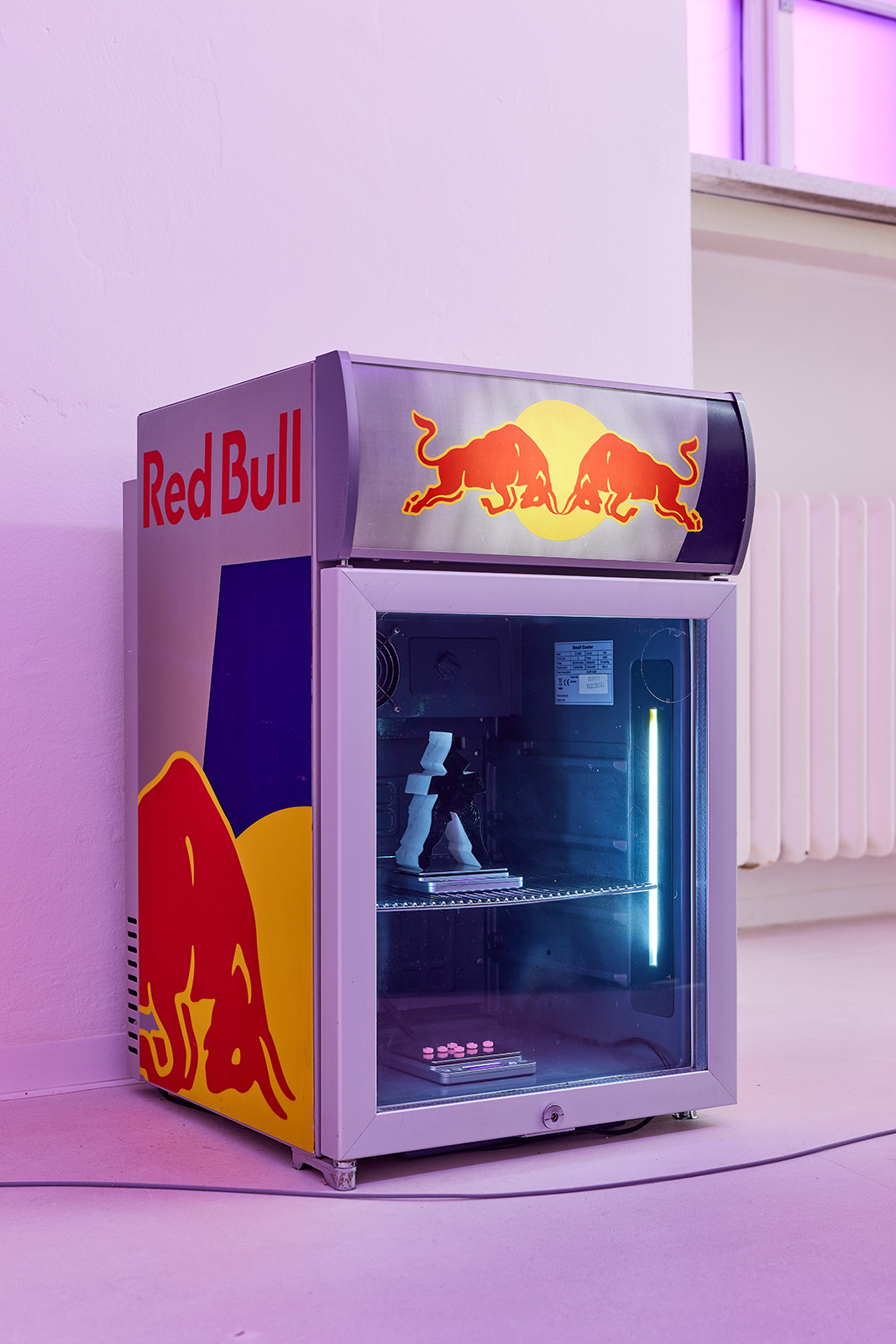 Red Bull fridge with hacked visual, objects