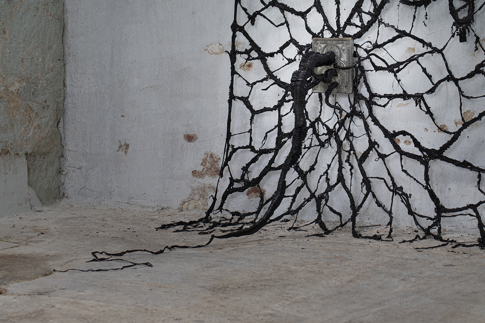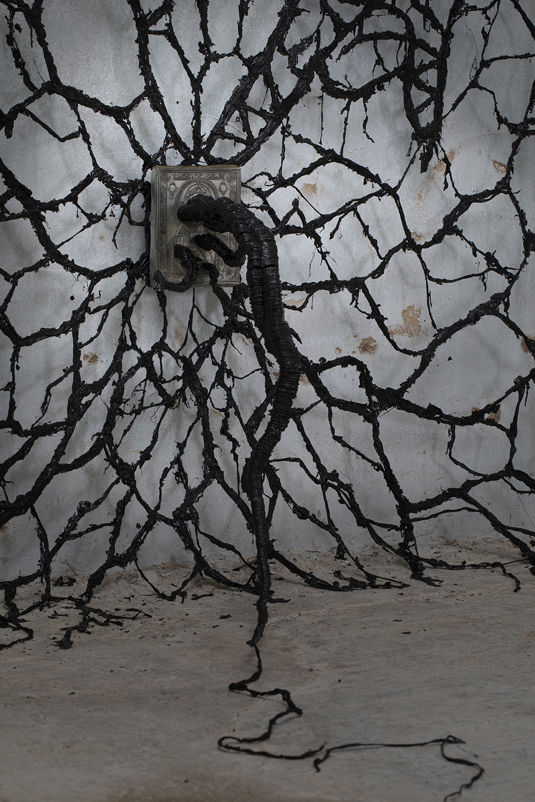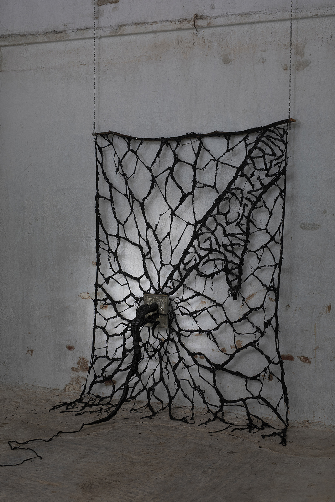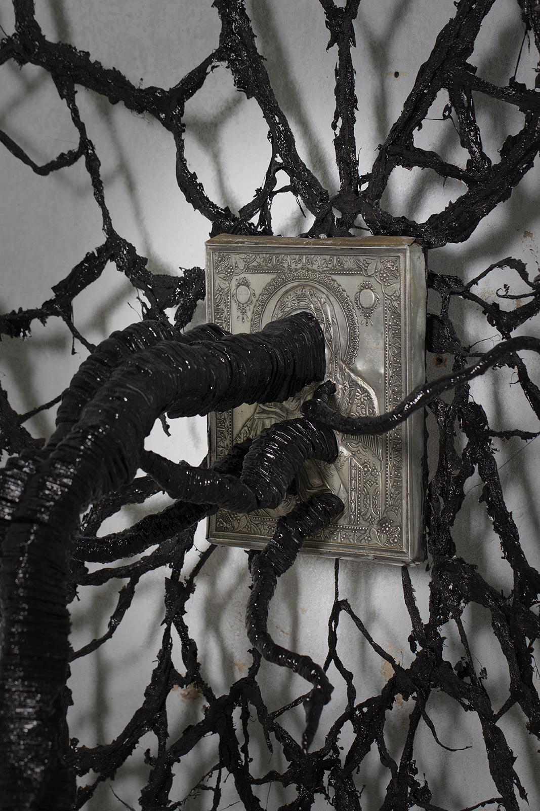 enamel paint, textile, aluminium riza, polistirol, chain, 200 x 150 x 150 cm